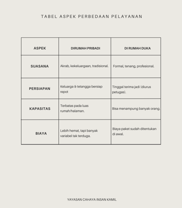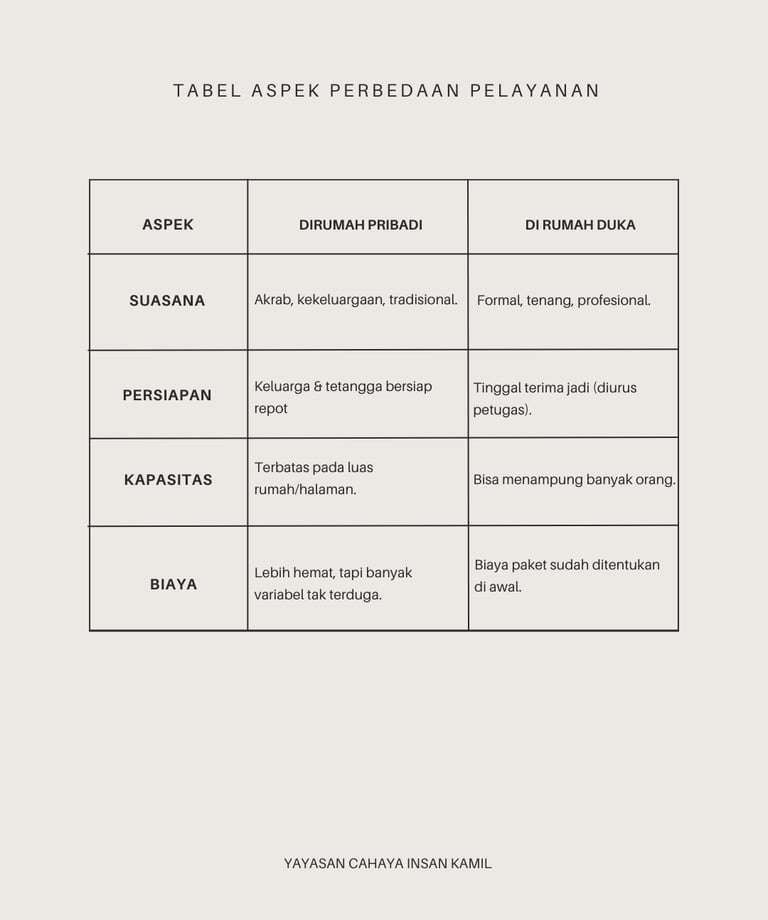 Tantangan: Biaya operasional di rumah duka biasanya lebih tinggi karena mencakup sewa ruangan dan fasilitas. Selain itu, suasananya mungkin terasa kurang "privat" jika ada beberapa keluarga lain yang juga mengadakan acara di gedung yang sama.