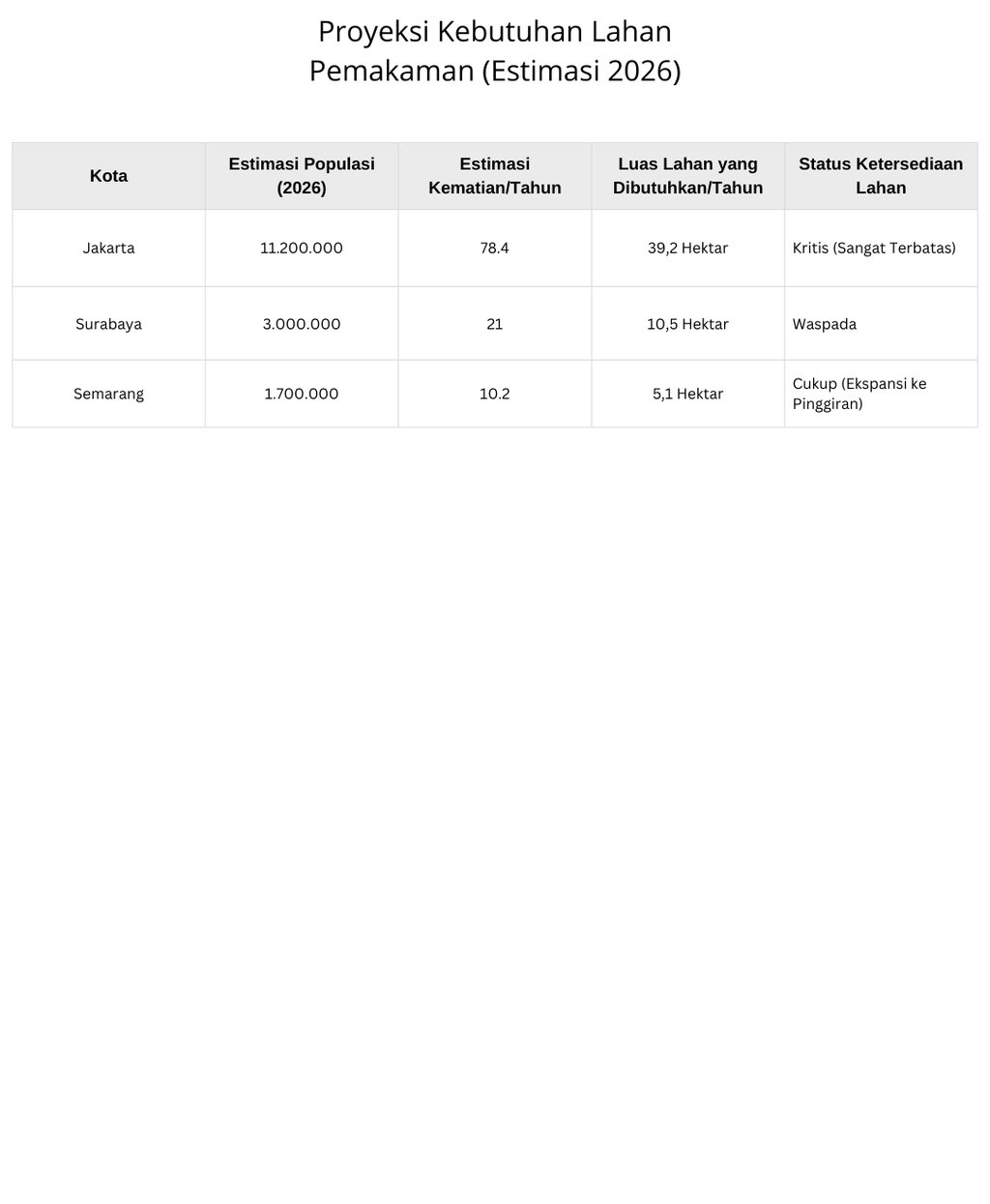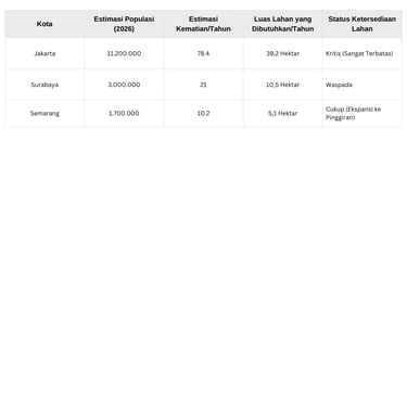 Temukan analisis dan proyeksi kebutuhan lahan untuk Tempat Pemakaman Umum (TPU) di tiga kota besar. Dapatkan informasi mendalam tentang tren dan kebutuhan lahan saat ini.
